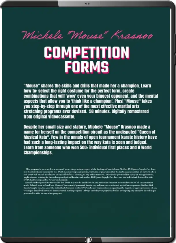Despite her small size and stature, Michele “Mouse” Krasnoo made a name for herself on the competition circuit as the undisputed “Queen of Musical Kata”. Few in the annals of open tournament karate history have had such a long-lasting impact on the way kata is seen and judged. Learn from someone who won 500+ individual first places and 8 World Championships.